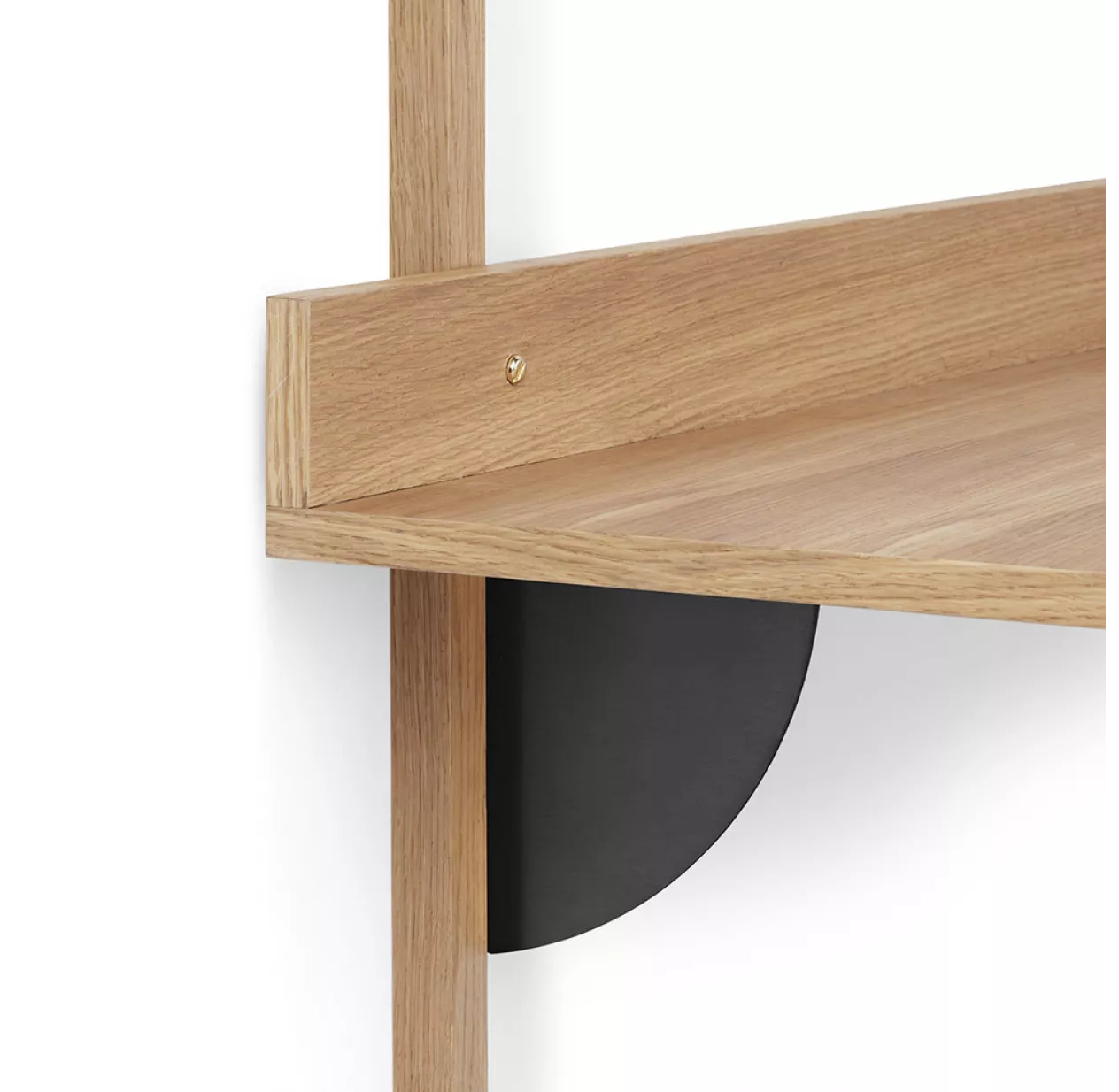 Le systĂšme modulaire Sector revisite l’Ă©tagĂšre murale du milieu du siĂšcle dans une version moderne et fonctionnelle. Le systĂšme mural Sector affirme une simplicitĂ© robuste dans un esprit naturel et minimaliste. Cette version du bureau mural Sector associe placage de chĂȘne naturel et laiton noirci. Il est aussi disponible en placage de frĂȘne teintĂ© noir et ses supports en laiton existent Ă©galement en laiton poli. Le bureau mural Sector de Ferm Living se fixe au mur avec des montants en bois massif et des vis apparentes. Il est idĂ©al pour crĂ©er un espace de travail dans une petite chambre, un hall d’entrĂ©e ou dans un coin du salon. Il s’associe parfaitement aux Ă©tagĂšres Sector qui se dĂ©clinent dans les mĂȘmes couleurs et finitions.