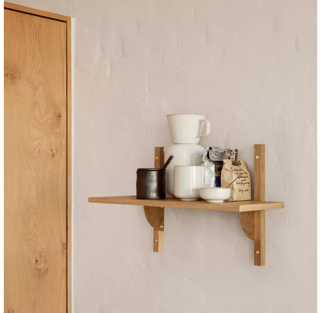 Le système modulaire Sector revisite l’étagère murale du milieu du siècle dans une version moderne et fonctionnelle. L’étagère Sector affirme une simplicité robuste dans un esprit naturel et minimaliste. Dans cette version Small et simple, l’étagère Sector associe placage de chêne naturel et laiton. Elle est aussi disponible en placage de frêne teinté noir et ses supports en laiton poli existent également en laiton noirci. L’étagère Simple Small Sector de Ferm Living se fixe au mur avec des montants en bois massif et des vis apparentes. Elle est idéale pour mettre en scène vos objets préférés dans une chambre enfant, un salon, des plantes ou des pots de rangement dans une cuisine. Elle s’associe parfaitement au bureau mural Sector qui se décline dans les mêmes couleurs et finitions.