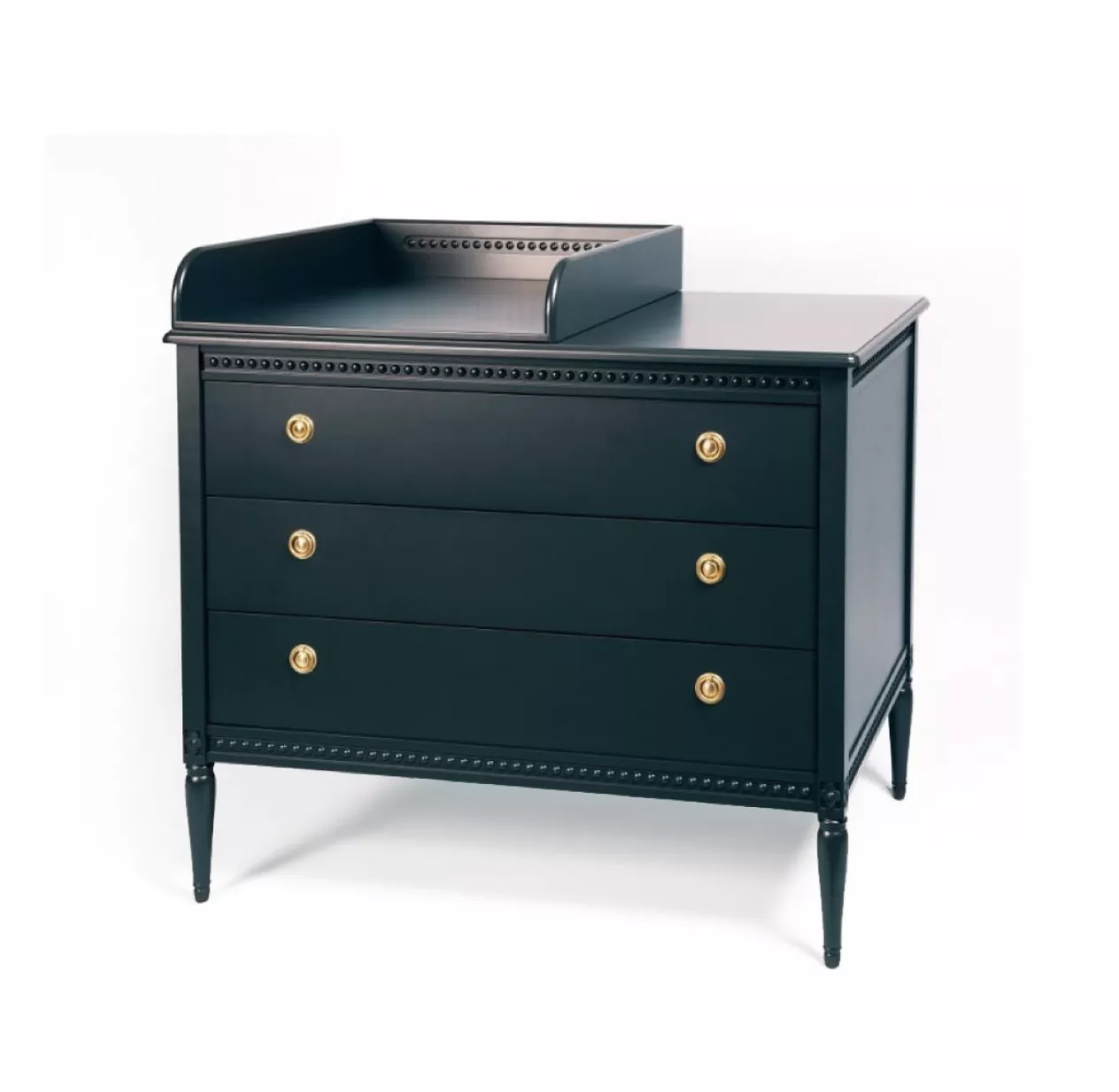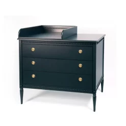 La commode Gustavienne propose 3 grands tiroirs ornĂ©s d’anneaux dorĂ©s, elle s’associe au plan Ă langer Gustavienne disponible en option pour se transformer en commode Ă langer, mais aussi au lit bĂ©bĂ©, Ă l’armoire et Ă la table Ă langer, pour constituer une chambre bĂ©bĂ© complète.