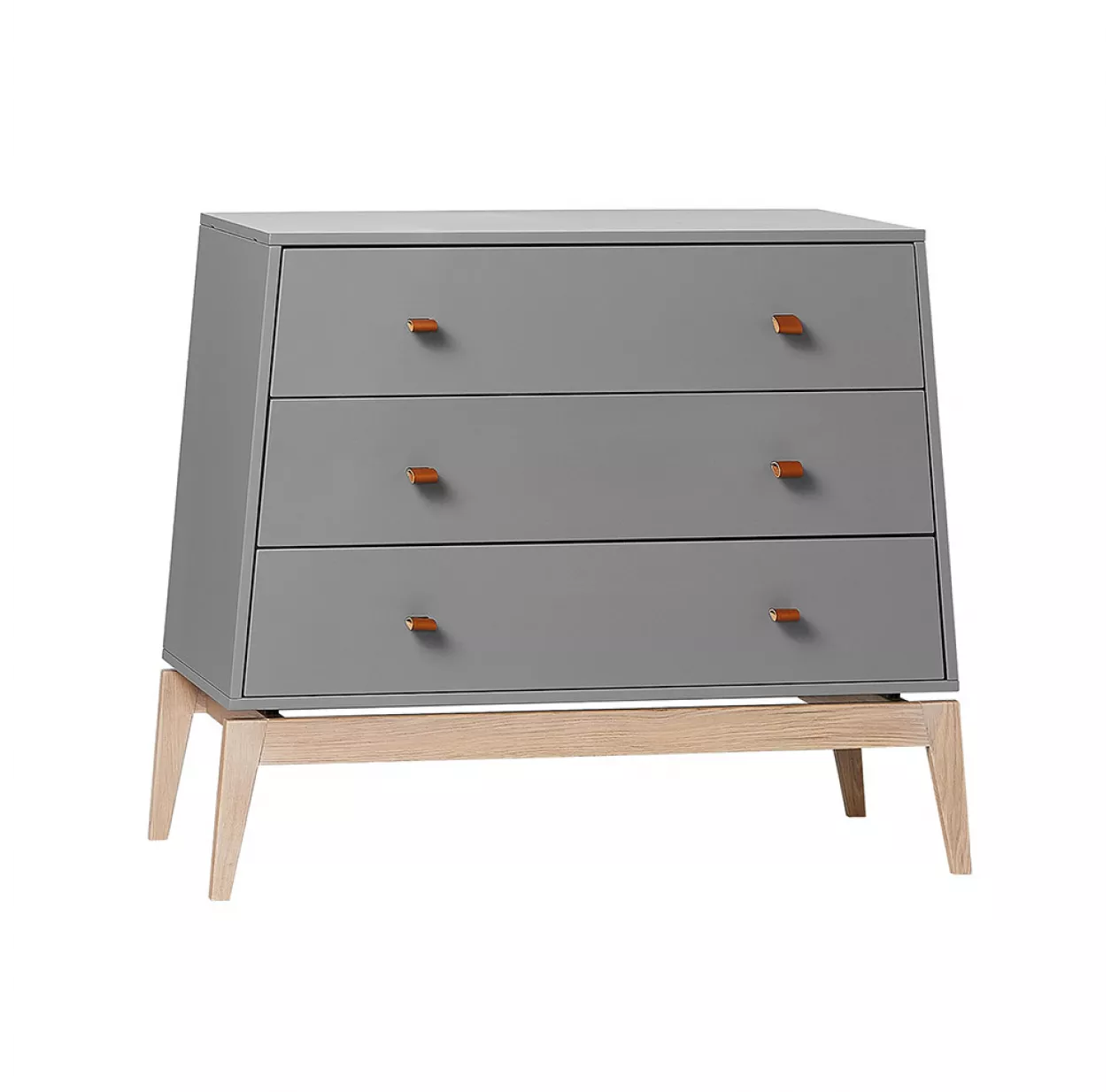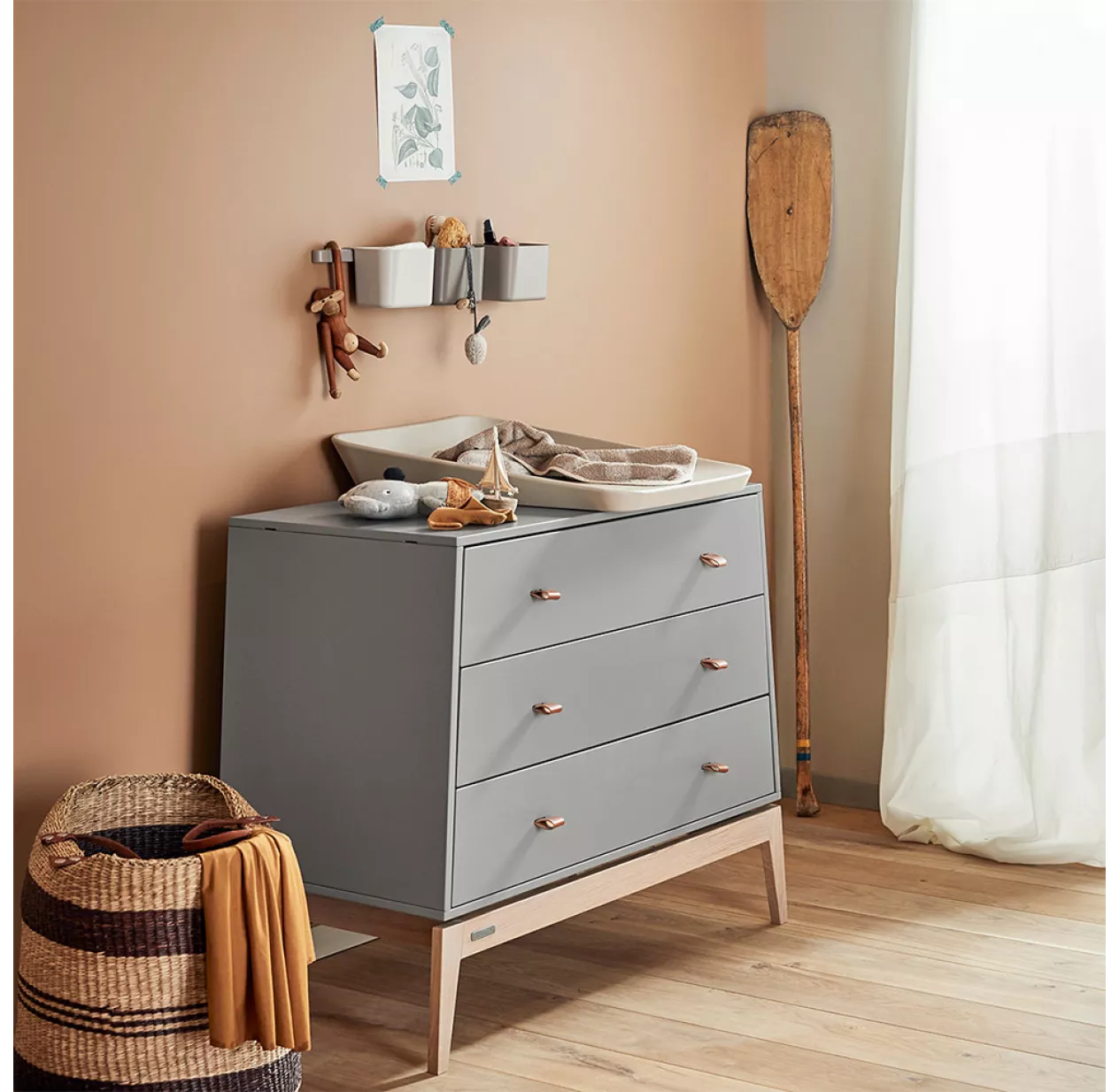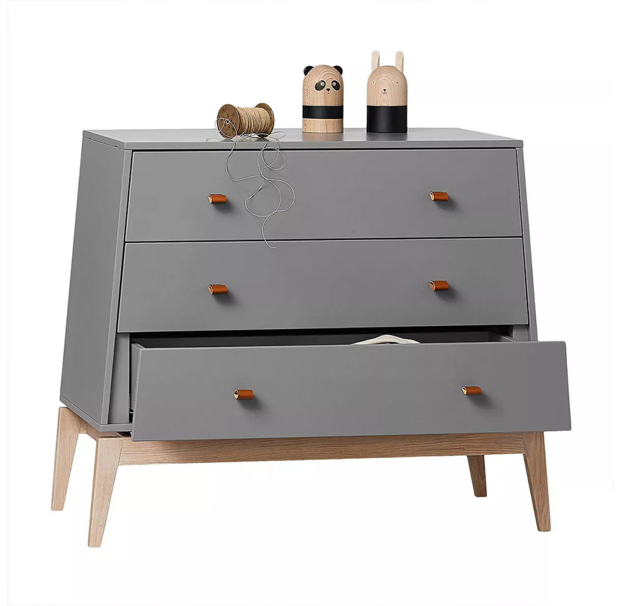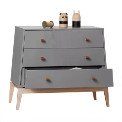 Cette commode 3 tiroirs dont les lignes Ă©purĂ©es jouent avec les obliques appartient Ă la toute nouvelle collection Luna de Leander. La commode enfant Luna offre 3 tiroirs de rangement, elle a Ă©tĂ© pensĂ©e pour ĂŞtre Ă©volutive et accompagner votre enfant dès la naissance. Son plan Ă langer disponible en option, en fait une commode Ă langer design et pratique. Vous pouvez aussi simplement lui associer le matelas Ă langer nomade Matty pour un meuble de change d’appoint.