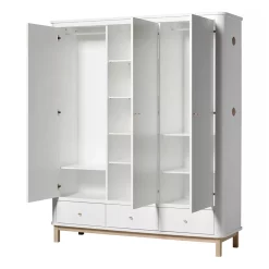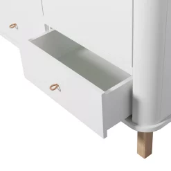 Cette armoire 3 portes blanche et en chĂȘne issue de la collection Wood, est idĂ©ale pour une chambre d’enfant. De conception artisanale et durable, elle est fabriquĂ©e dans le respect du design scandinave. Des lignes douces et arrondies, pour une chambre Ă la dĂ©coration pleine de poĂ©sie. Les poignĂ©es sont en cuir et sont fabriquĂ©es Ă la main. L’armoire possĂšde 3 tringles, 3 tiroirs et de nombreux compartiments de rangement. Elle dispose Ă©galement de petits portants ronds sur les cĂŽtĂ©s, extensibles qui se tirent facilement, pour suspendre des vĂȘtements. Craquez pour cette jolie armoire, fonctionnelle et design.Â