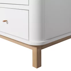 L’armoire est disponible avec les pieds en chĂȘne massif ou en bouleau laquĂ© blanc.