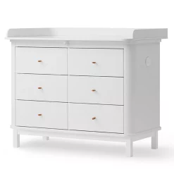 La commode à langer est disponible avec les pieds en chêne massif ou en bouleau laqué blanc mais également avec un petit plan à langer.