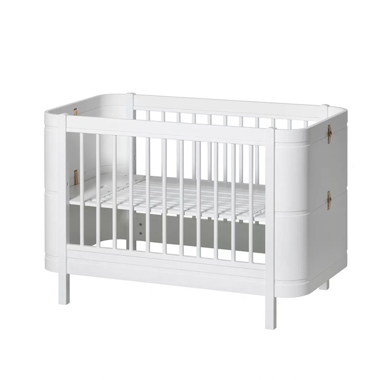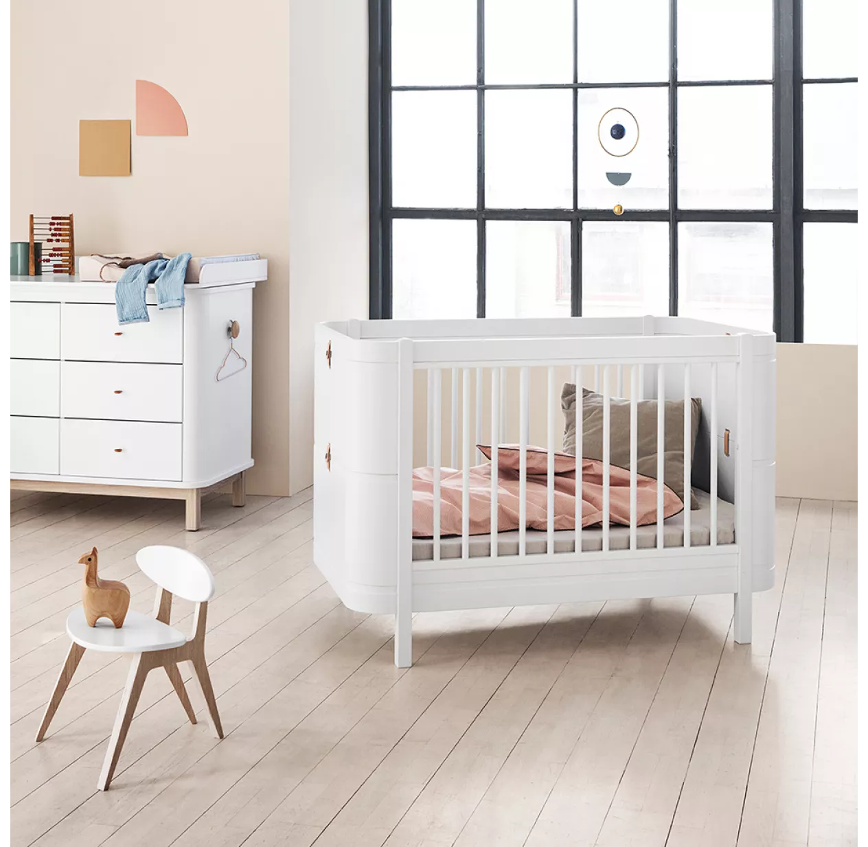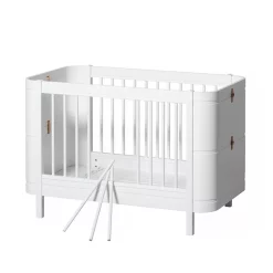 Le lit bébé évolutif 5 en 1 Mini+ Wood est également disponible en blanc et chêne.