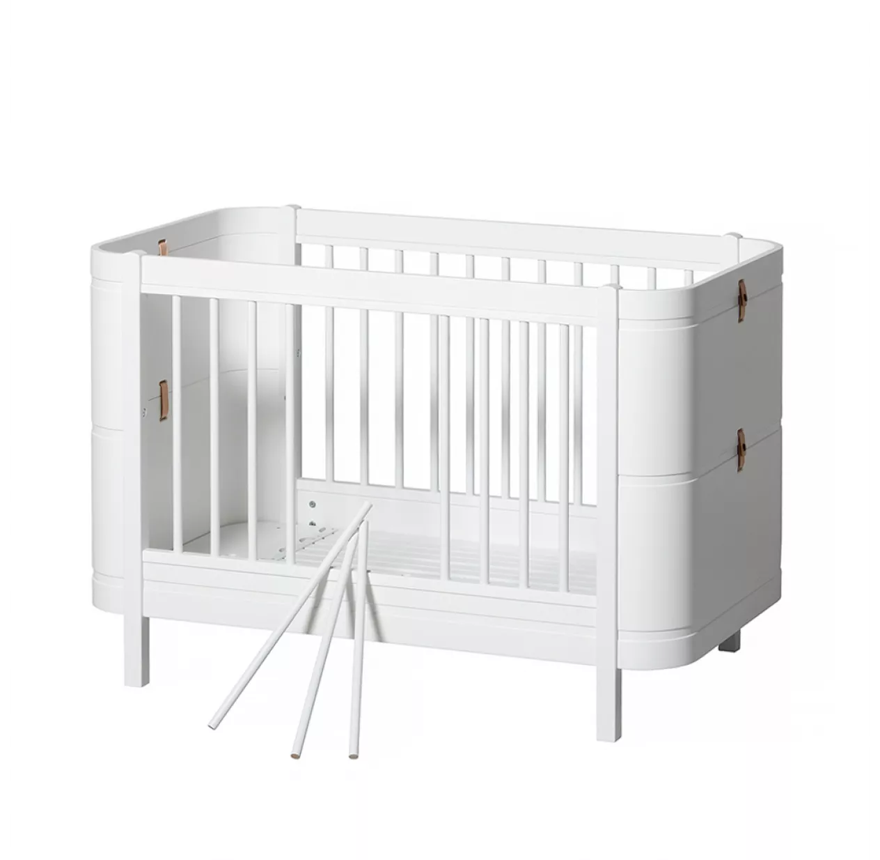 Dimensions lit bébé Mini+ Wood : largeur : 74 cm, longueur : 126 cm et hauteur : 87 cm.