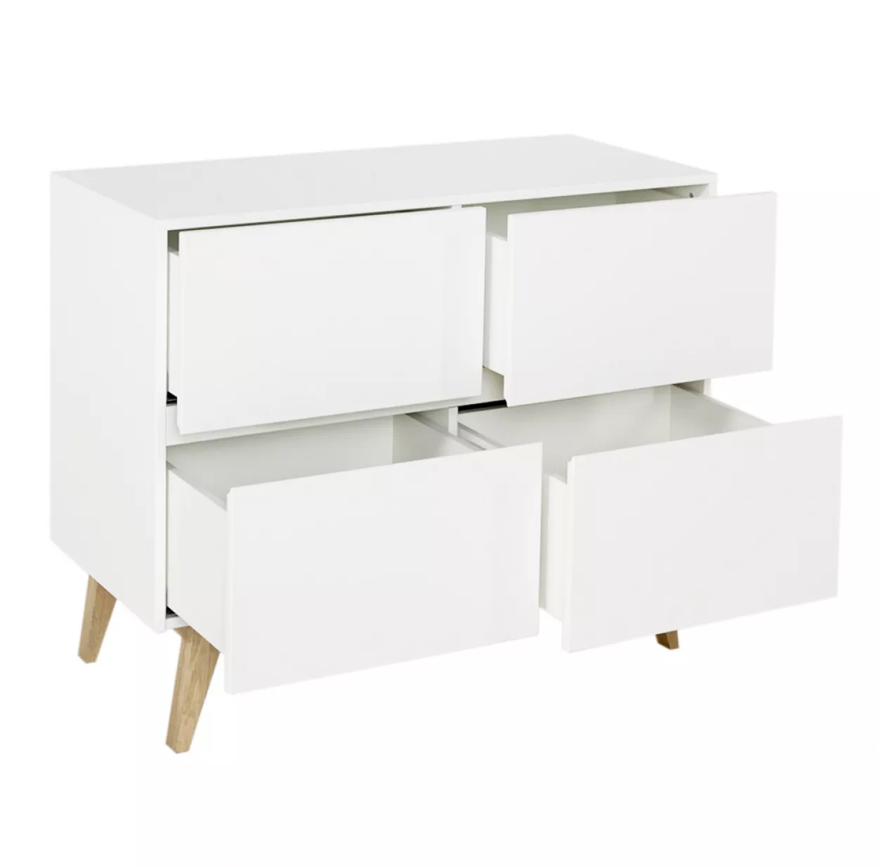 La commode 4 tiroirs Trendy offrira une ambiance un brin rĂ©tro Ă la chambre de votre bĂ©bĂ© ou de votre enfant. On craque pour son design Ă©purĂ© et intemporel. La commode Trendy s’accordera parfaitement avec le mobilier de la mĂŞme collection. De plus, elle est idĂ©ale pour une chambre de bĂ©bĂ© car elle pourra accueillir l’extension plan Ă langer Trendy (disponible en option).
