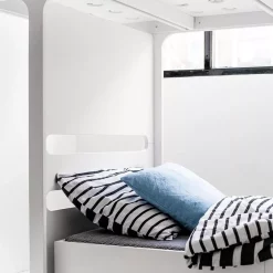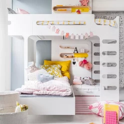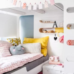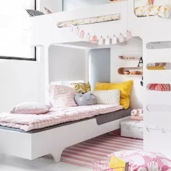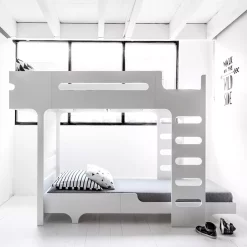 Le lit mezzanine F Bunk Bed dispose de 2 Ă©chelles, une de chaque cĂ´tĂ©, pour vous donner encore plus de libertĂ© dans l’amĂ©nagement de la chambre de vos enfants. Un double accès qui lui donne aussi un air de cabanne suspendue. La stabilitĂ© du lit mezzanine est renforcĂ©e par une cloison ajourĂ©e qui fait office de pied. Ses ouvertures crĂ©ent une communication ludique avec l’espace situĂ© sous le lit. Le lit mezzanine F Bunk Bed convient Ă l’enfant dès 6 ans.