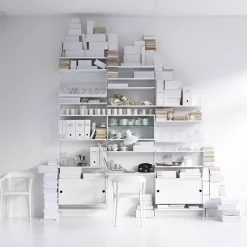 Vous pouvez également rajouter les étagères pour magazines, les étagères métalliques ou en bois, le plateau de bureau et tous les autres rangements modulables String. Vous pouvez aussi mélanger les couleurs.