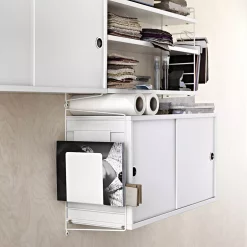 Ce caisson blanc Ă portes coulissantes s’adapte aux portants muraux et portants au sol String. Vous pouvez crĂ©er votre propre composition murale grâce Ă ce caisson et crĂ©er un maximum de rangements.