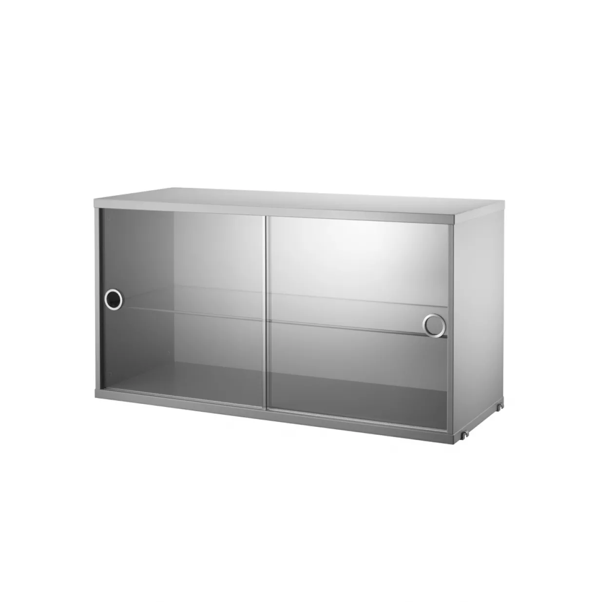 Ce caisson gris Ă portes vitrĂ©es coulissantes s’adapte aux portants muraux et portants au sol String. Vous pouvez crĂ©er votre propre composition murale grâce Ă ce caisson et crĂ©er un maximum de rangements.