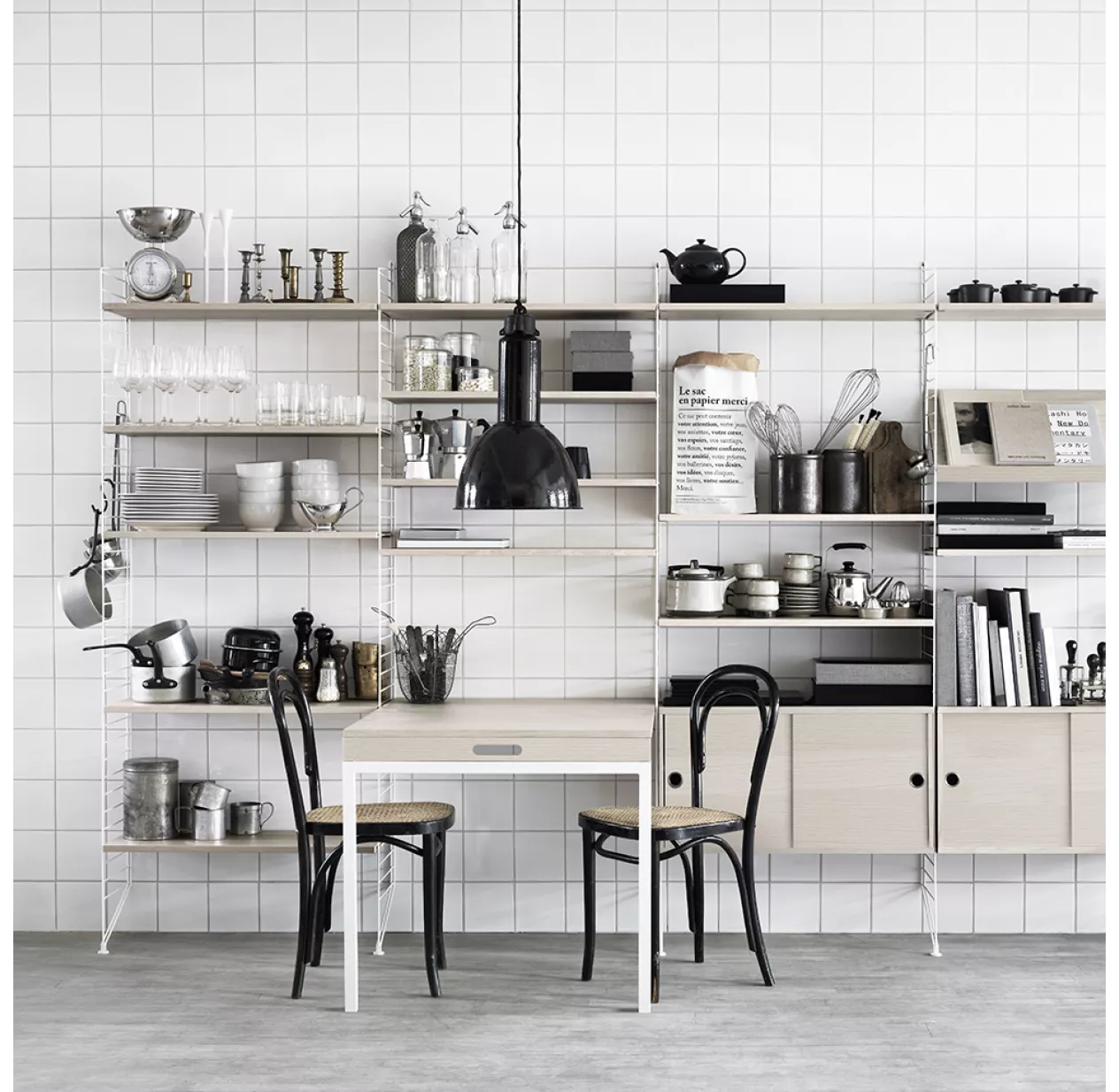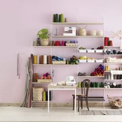 Vous pouvez également rajouter les caissons de rangement, le plateau de bureau, les étagères pour magazines, les étagères métalliques, la table murale pliante et tous les autres rangements modulables String. Vous pouvez aussi mélanger les couleurs.