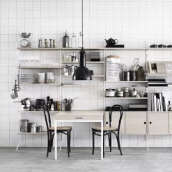 GrĂące Ă cette table murale pliante en frĂȘne et blanche, vous pouvez crĂ©er votre propre composition murale. Un Ă©lĂ©ment design pour crĂ©er un espace qui vous ressemble. Elle s’adapte aux portants muraux et portants au sol String.
