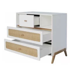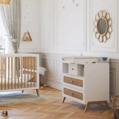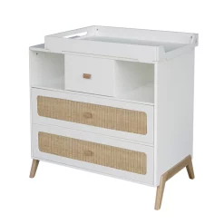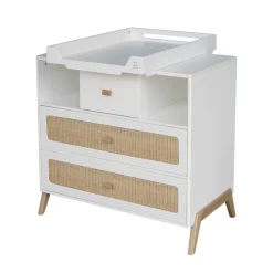 La commode Marélia Théo dispose de 2 tiroirs en cannage de rotin tressé et d’un plus petit tiroir avec rangements accolés. Elle constitue un magnifique meuble déco d’inspiration vintage. Vous pouvez lui associer le plan à langer blanc Théo pour transformer temporairement le meuble en commode à langer. Ses tiroirs à fermeture douce, son style rétro et sobre en font un meuble parfaitement adapté à la chambre de votre bébé. Elle s’associe au lit bébé, au lit enfant, à la table à langer ou encore à l’armoire de la même collection pour une chambre complète déco et durable. En associant subtilement bois et rotin dans ses collections de mobilier enfant, la marque Théo propose un style de chambre à la fois contemporain et rétro qui apporte un vent de fraîcheur dans l’univers de la déco enfant.