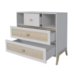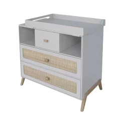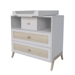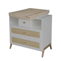 La commode Marélia Théo dispose de 2 tiroirs en cannage de rotin tressé et d’un plus petit tiroir avec rangements accolés. Elle constitue un magnifique meuble déco d’inspiration vintage. Vous pouvez lui associer le plan à langer blanc Théo pour transformer temporairement le meuble en commode à langer. Ses tiroirs à fermeture douce, son style rétro et sobre en font un meuble parfaitement adapté à la chambre de votre bébé. Elle s’associe au lit bébé, au lit enfant, à la table à langer ou encore à l’armoire de la même collection pour une chambre complète déco et durable. En associant subtilement bois et rotin dans ses collections de mobilier enfant, la marque Théo propose un style de chambre à la fois contemporain et rétro qui apporte un vent de fraîcheur dans l’univers de la déco enfant.