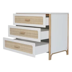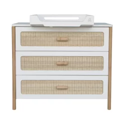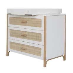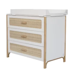 La commode Océania Théo dispose de 3 tiroirs en cannage de rotin tressé. Elle constitue un magnifique meuble déco d’inspiration vintage. Vous pouvez lui associer le plan à langer blanc Théo pour transformer temporairement le meuble en commode à langer. Ses tiroirs à fermeture douce, son style bohême et sobre en font un meuble parfaitement adapté à la chambre de votre bébé. Elle s’associe au lit bébé, au lit enfant, à la table à langer ou encore à l’armoire de la même collection pour une chambre complète déco et durable. En associant subtilement bois et rotin dans ses collections de mobilier enfant, la marque Théo propose un style de chambre à la fois contemporain et rétro qui apporte un vent de fraîcheur dans l’univers de la déco enfant.