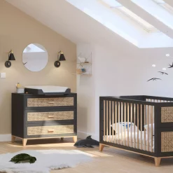 La commode Océania Théo dispose de 3 tiroirs en cannage de rotin tressé. Elle constitue un magnifique meuble déco d’inspiration vintage. Vous pouvez lui associer le plan à langer blanc Théo pour transformer temporairement le meuble en commode à langer. Ses tiroirs à fermeture douce, son style bohême et sobre en font un meuble parfaitement adapté à la chambre de votre bébé. Elle s’associe au lit bébé, au lit enfant, à la table à langer ou encore à l’armoire de la même collection pour une chambre complète déco et durable. En associant subtilement bois et rotin dans ses collections de mobilier enfant, la marque Théo propose un style de chambre à la fois contemporain et rétro qui apporte un vent de fraîcheur dans l’univers de la déco enfant.