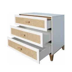 La commode Nami ThĂ©o dispose de 3 tiroirs en cannage de rotin. Elle constitue un magnifique meuble dĂ©co d’inspiration vintage. Vous pouvez lui associer le plan Ă langer blanc ThĂ©o ou le nouveau plan Ă langer en rotin pour transformer temporairement le meuble en commode Ă langer. Ses tiroirs Ă fermeture douce, son style rĂ©tro et sobre en font un meuble parfaitement adaptĂ© Ă la chambre de votre bĂ©bĂ©. Elle s’associe au lit bĂ©bĂ©, au lit enfant, Ă la table Ă langer ou encore Ă l’armoire de la mĂŞme collection pour une chambre complète dĂ©co et durable. En associant subtilement bois et rotin dans ses collections de mobilier enfant, la marque ThĂ©o propose un style de chambre Ă la fois contemporain et rĂ©tro qui apporte un vent de fraĂ®cheur dans l’univers de la dĂ©co enfant.