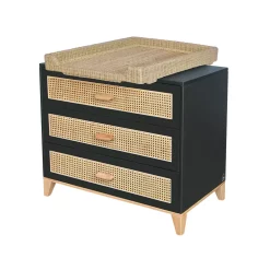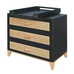 La commode Nami ThĂ©o dispose de 3 tiroirs en cannage de rotin. Elle constitue un magnifique meuble dĂ©co d’inspiration vintage. Vous pouvez lui associer le plan Ă langer blanc ThĂ©o ou le nouveau plan Ă langer en rotin pour transformer temporairement le meuble en commode Ă langer. Ses tiroirs Ă fermeture douce, son style rĂ©tro et sobre en font un meuble parfaitement adaptĂ© Ă la chambre de votre bĂ©bĂ©. Elle s’associe au lit bĂ©bĂ©, au lit enfant, Ă la table Ă langer ou encore Ă l’armoire de la mĂŞme collection pour une chambre complète dĂ©co et durable. En associant subtilement bois et rotin dans ses collections de mobilier enfant, la marque ThĂ©o propose un style de chambre Ă la fois contemporain et rĂ©tro qui apporte un vent de fraĂ®cheur dans l’univers de la dĂ©co enfant.