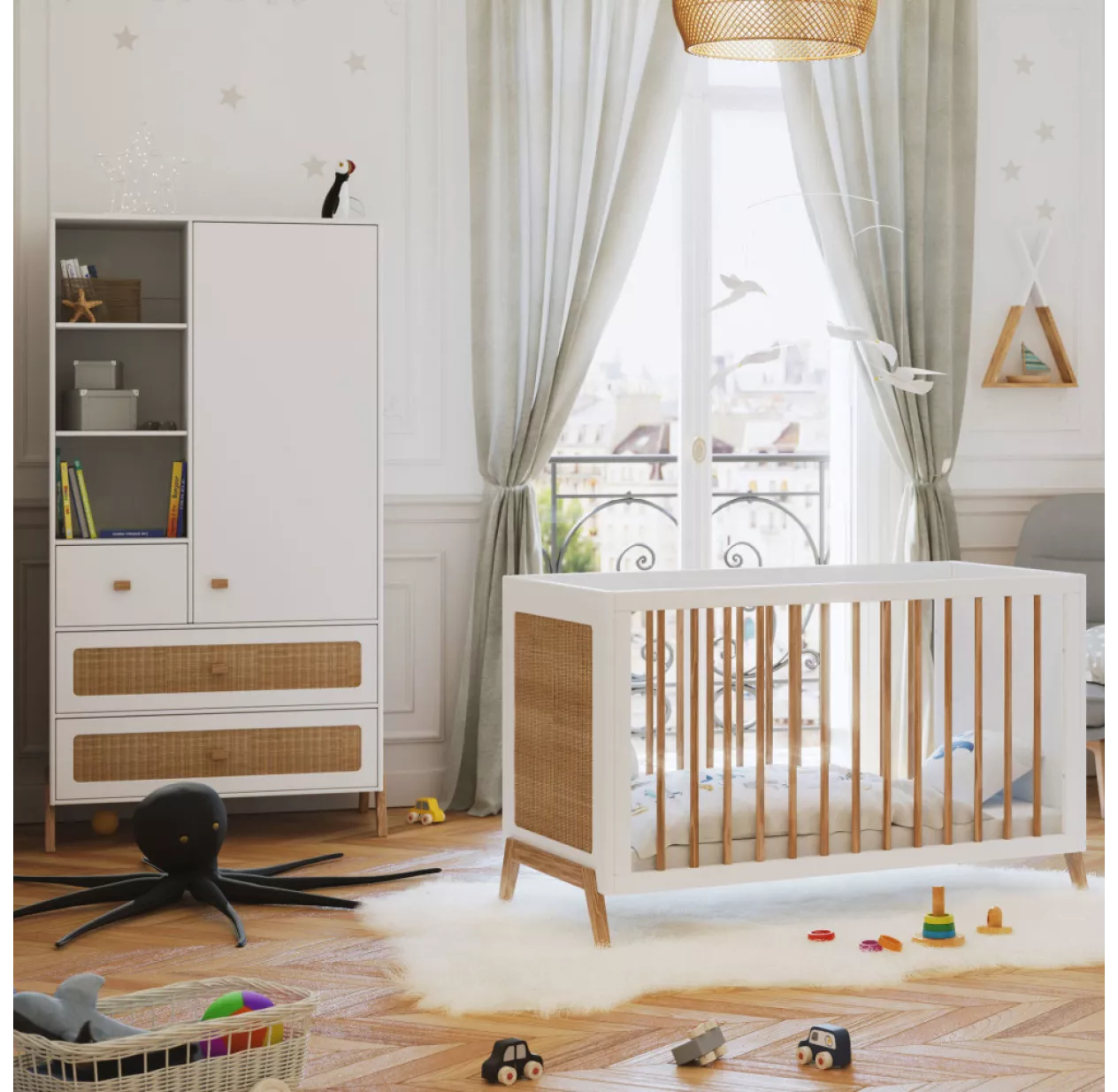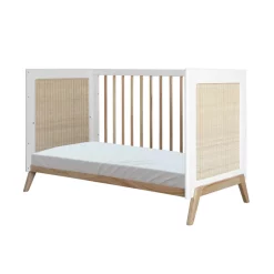 Le lit bébé Marélia Théo est un lit évolutif dont le couchage en 60 x 120 cm permet d’accompagner votre bébé de la naissance jusqu’à 3 ans environ. Son sommier est réglable en 2 hauteurs. Le lit bébé Marélia peut être associé au plan à langer qui se fixe directement sur les rebords du lit. Un kit de conversion disponible en option vous permet de transformer ce lit bébé en un élégant lit junior. Le design sobre et épuré du lit Marélia Théo est idéal pour une chambre bébé durable. En associant subtilement bois et rotin dans ses collections de mobilier enfant, la marque Théo propose un style de chambre à la fois contemporain et rétro qui apporte un vent de fraîcheur dans l’univers de la déco enfant.