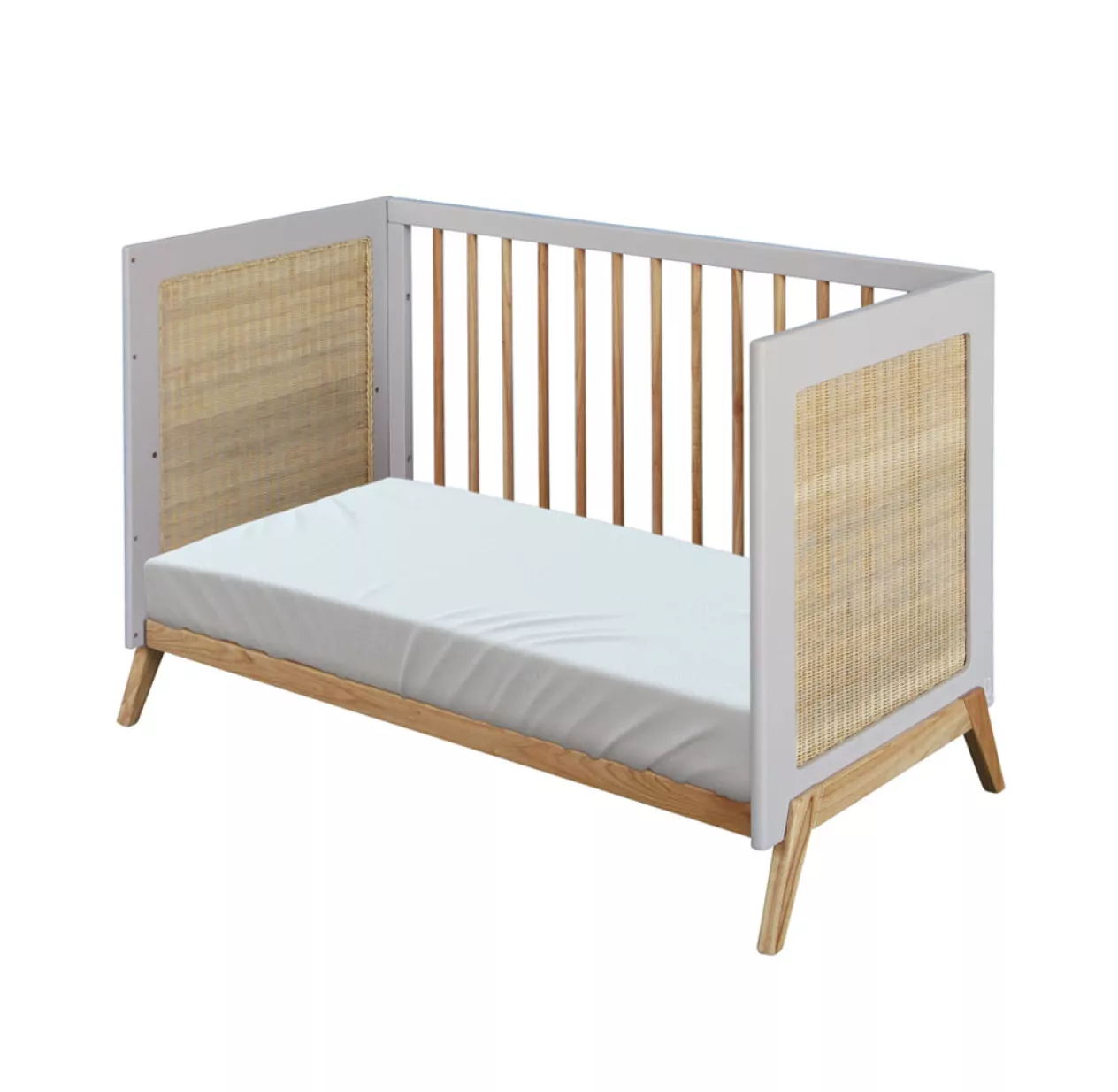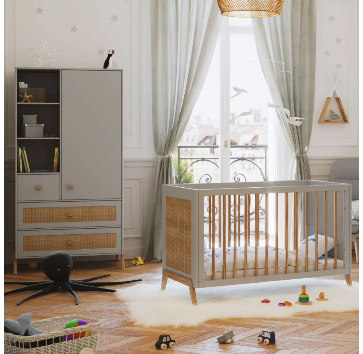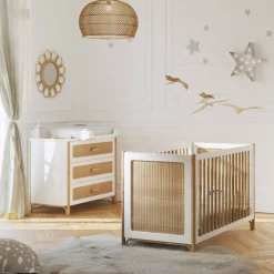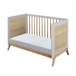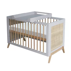 Le lit bébé Marélia Théo est un lit évolutif dont le couchage en 60 x 120 cm permet d’accompagner votre bébé de la naissance jusqu’à 3 ans environ. Son sommier est réglable en 2 hauteurs. Le lit bébé Marélia peut être associé au plan à langer qui se fixe directement sur les rebords du lit. Un kit de conversion disponible en option vous permet de transformer ce lit bébé en un élégant lit junior. Le design sobre et épuré du lit Marélia Théo est idéal pour une chambre bébé durable. En associant subtilement bois et rotin dans ses collections de mobilier enfant, la marque Théo propose un style de chambre à la fois contemporain et rétro qui apporte un vent de fraîcheur dans l’univers de la déco enfant.