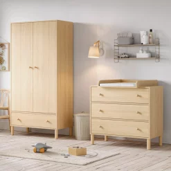 L’armoire Tela de Vox s’inspire de la tendance dĂ©co Japandi qui associe minimalisme japonais et design scandinave. Un style sobre et trĂšs naturel, pour une chambre de bĂ©bĂ© ou d’enfant actuelle. L’armoire Tela s’associe Ă toute les piĂšces de la collection pour offrir une chambre complĂšte. Son amĂ©nagement intĂ©rieur est optimal : 2 penderies, 6 Ă©tagĂšres et 1 tiroir infĂ©rieur vous permettent de ranger les affaires de vos enfants de maniĂšre optimale.Â